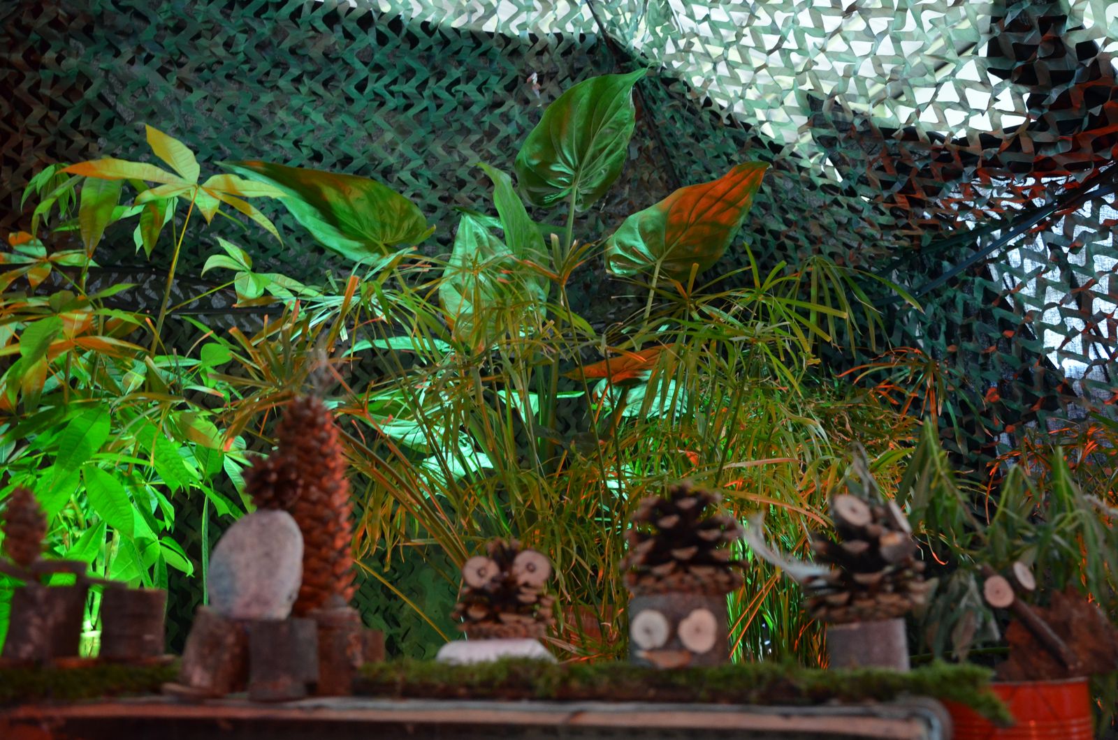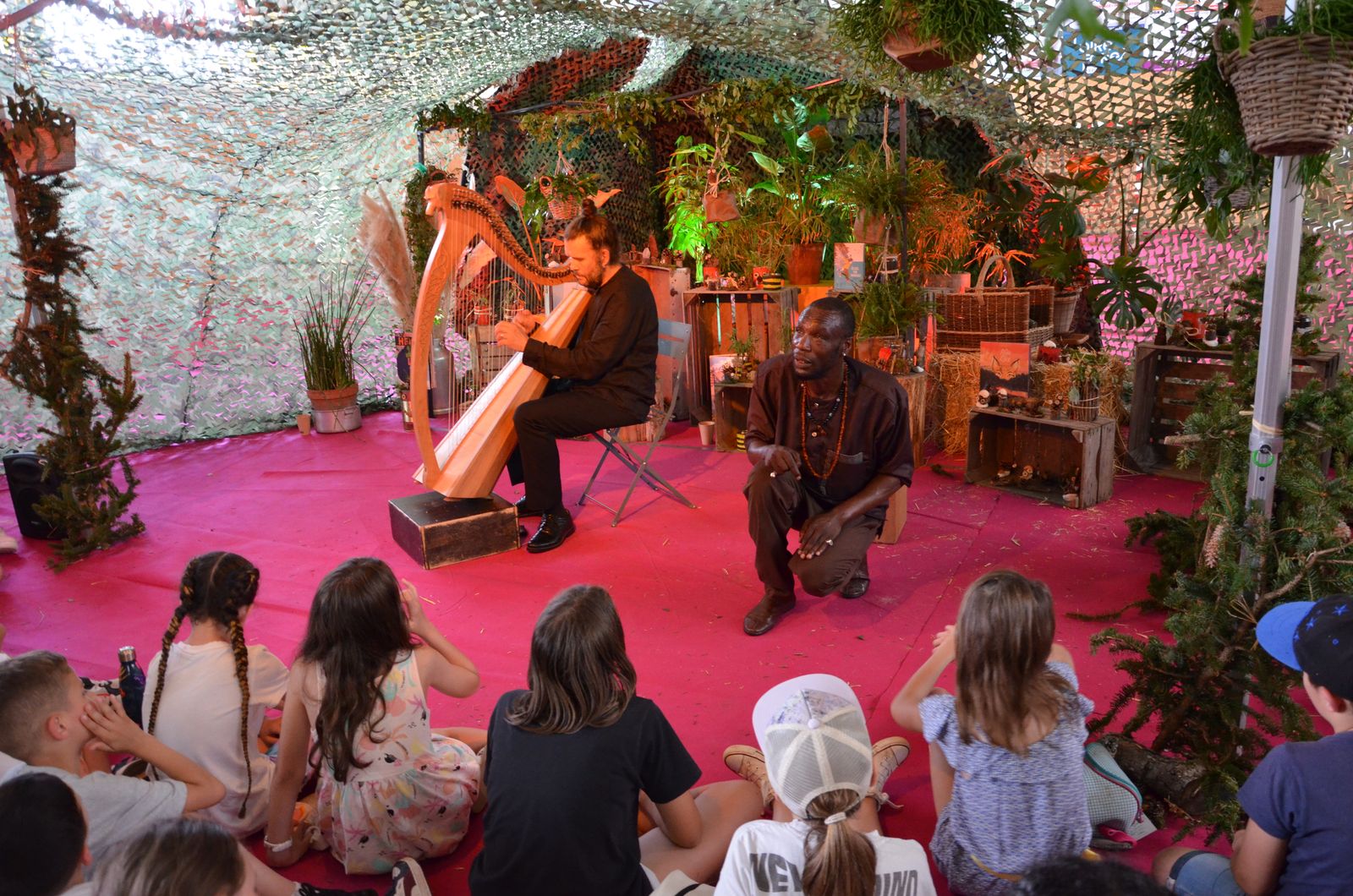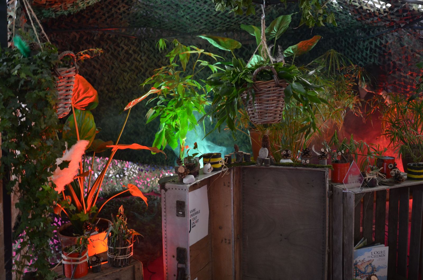 Végétalisation d’un gymnase dans le cadre du festival « Vivre ensemble tout un art » organisé par l’UFCV Loire et la Fédération Familles Rurales de la Loire. Mise en place d’un scénographie pour la représentation du griot et de son harpiste.
